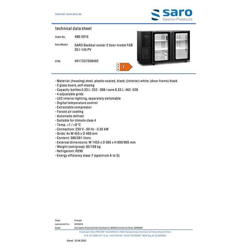 SARO Backbarcooler med 2 glasdøre, FGB 251-145 PV
