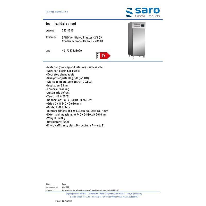 SARO erhvervsfryser – 2/1 GN KYRA GN 700 BT